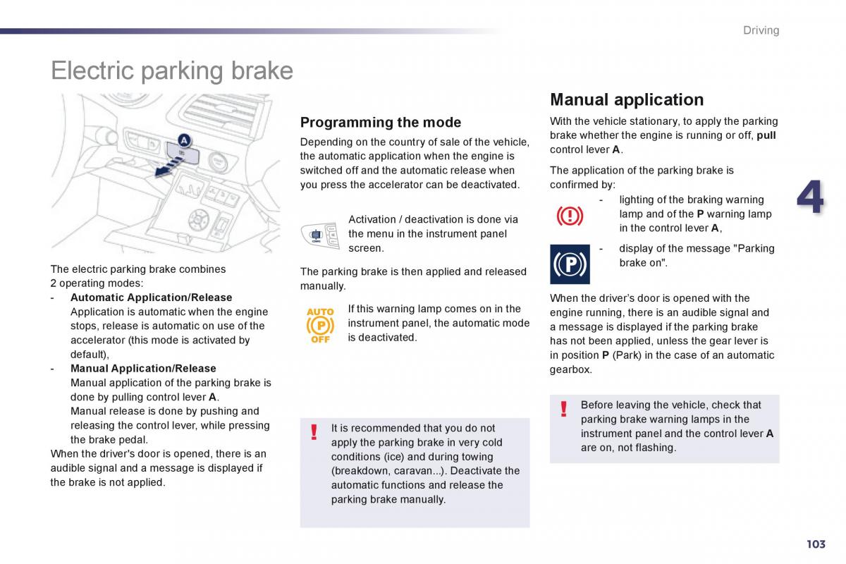 stops, release is automatic on use of the instrument panel, the automatic mode a message is displayed if the parking brake