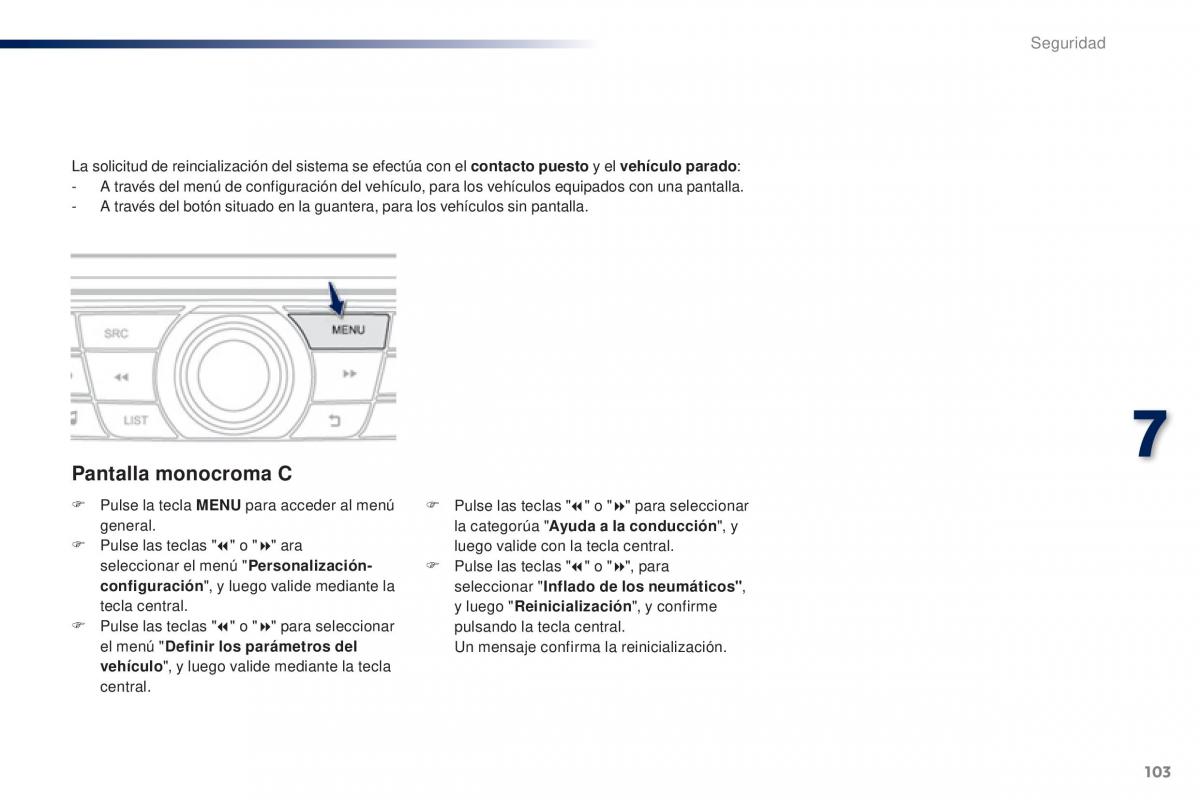 La solicitud de reincialización del sistema se efectúa con el contacto puesto y el vehículo parado: