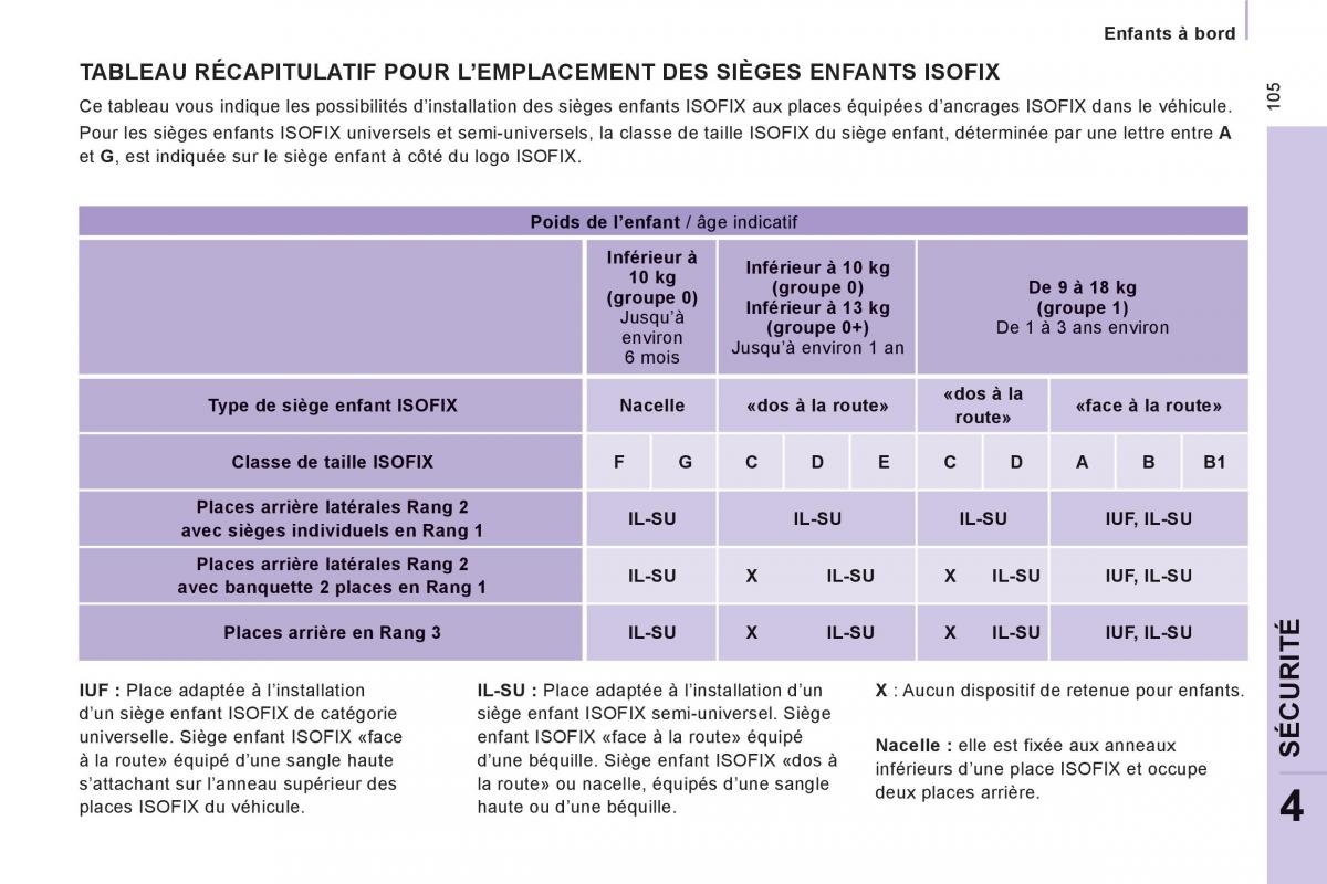 TABLEAU RÉCAPITULATIF POUR L’EMPLACEMENT DES SIÈGES ENFANTS ISOFIX