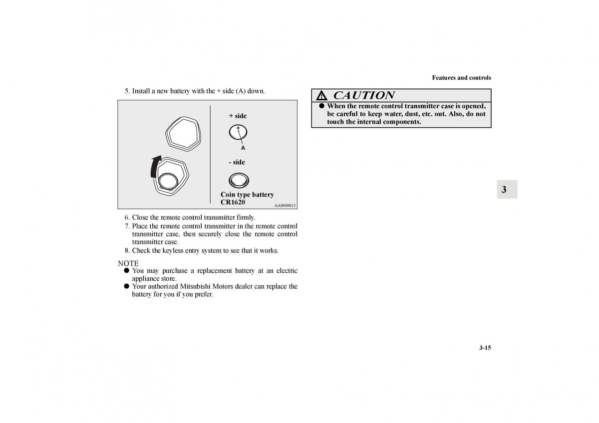 5. Install a new battery with the + side (A) down. ! CAUTION