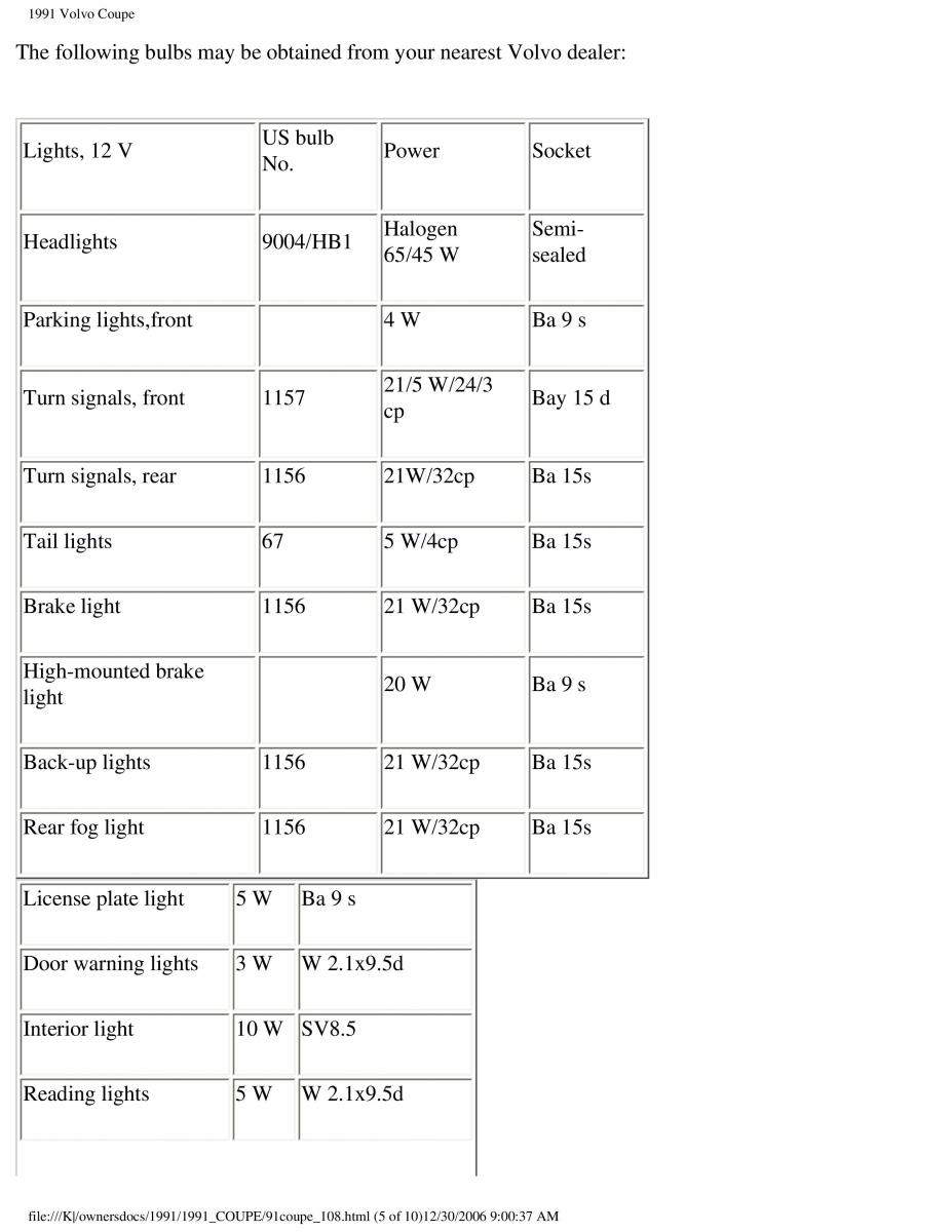The following bulbs may be obtained from your nearest Volvo dealer: