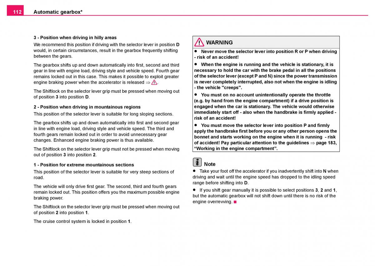 remain locked out. This position offers you the maximum possible engine • If you shift gear manually it is possible to select positions 3, 2 and 1,