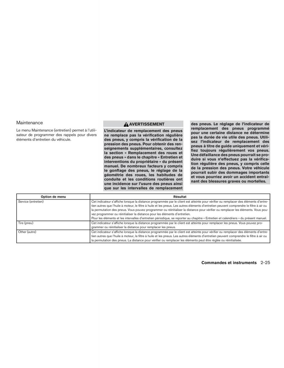 LemenuMaintenance(entretien) permet à l’utili-L’indicateur de remplacement des pneusremplacement des pneus programmé