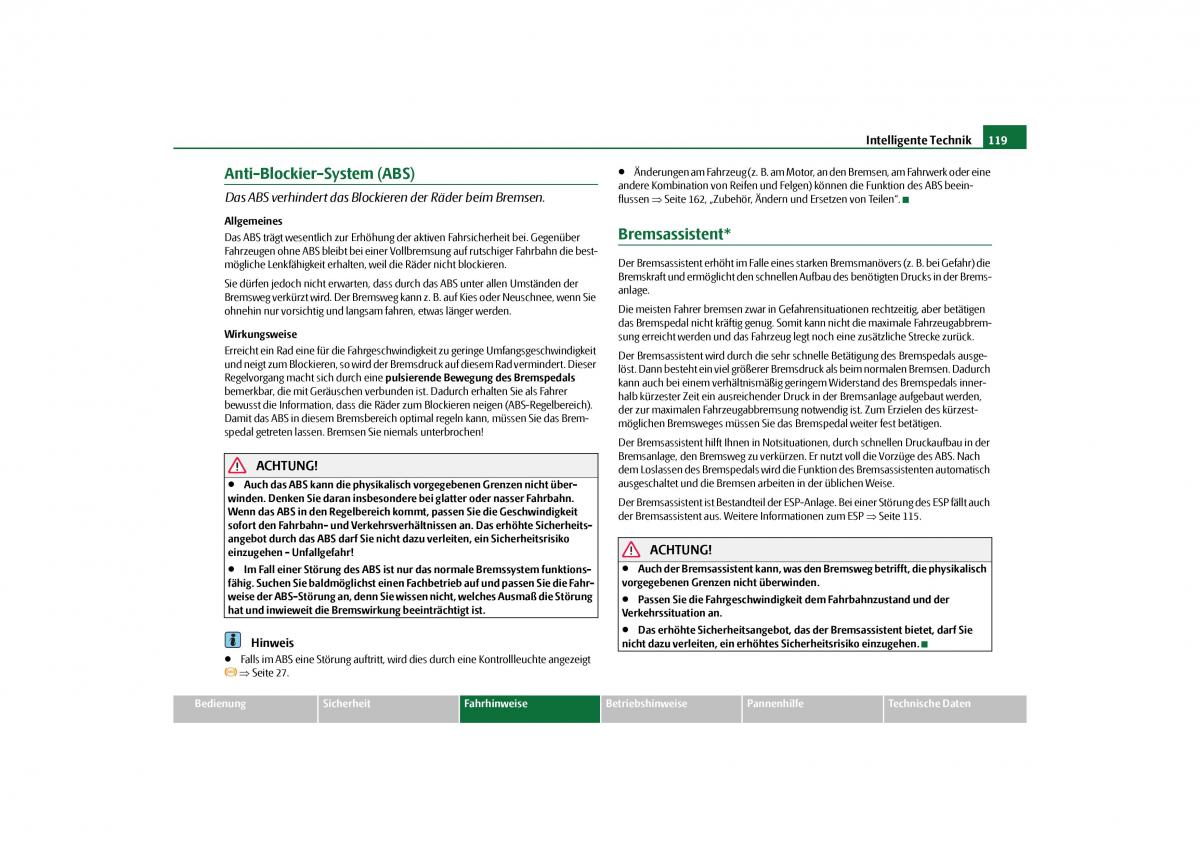 Das ABS verhindert das Blockieren der Räder beim Bremsen.flussen Seite162, „Zubehör, Ändern und Ersetzen von Teilen“.