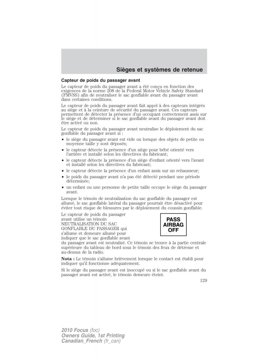 (FMVSS) afin de neutraliser le sac gonflable avant du passager avant