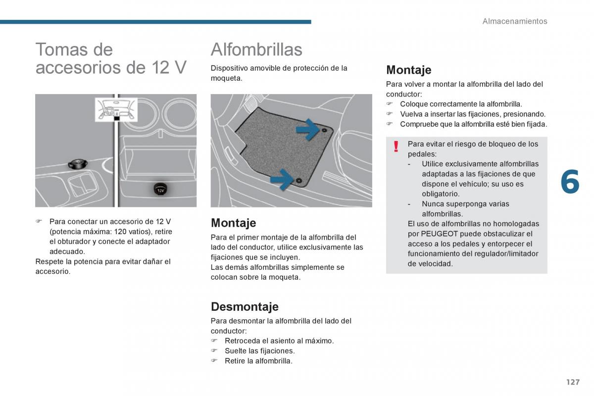 (potencia máxima: 120 vatios), retire Para el primer montaje de la alfombrilla del por PEUGEOT puede obstaculizar el