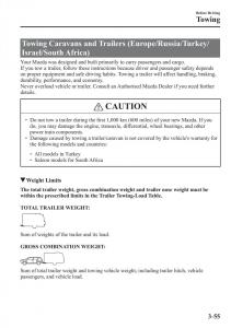 Do not tow a trailer during the fi rst 1,000 km (600 miles) of your new Mazda. If you