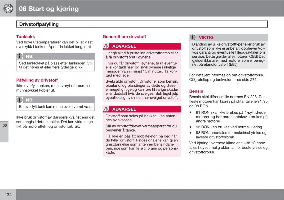 06 tivt på motoreffekt og drivstofforbruk. Slå av drivstoffdrevet varmeapparat før du• 95 RON kan brukes ved normal kjøring.