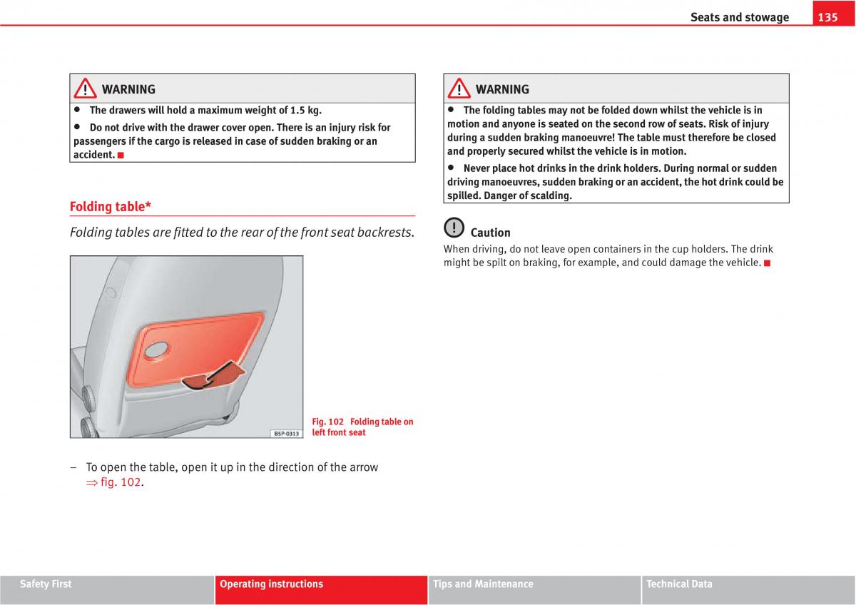 • The drawers will hold a maximum weight of 1.5 kg. • The folding tables may not be folded down whilst the vehicle is in