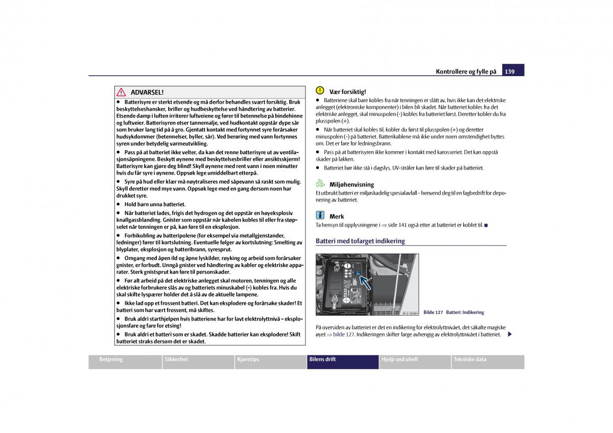 Bruk aldri et batteri som er skadet. Skadde batterier kan eksplodere! Skift øyet bilde127. Indikeringen skifter farge avhengig av elektrolyttnivået i batteriet.