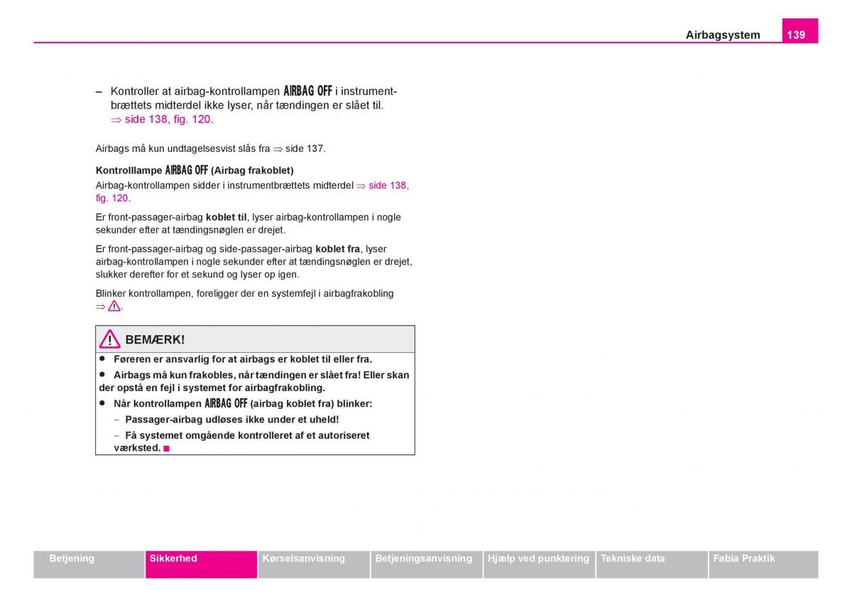 Airbags må kun undtagelsesvist slås fra ⇒ side 137.