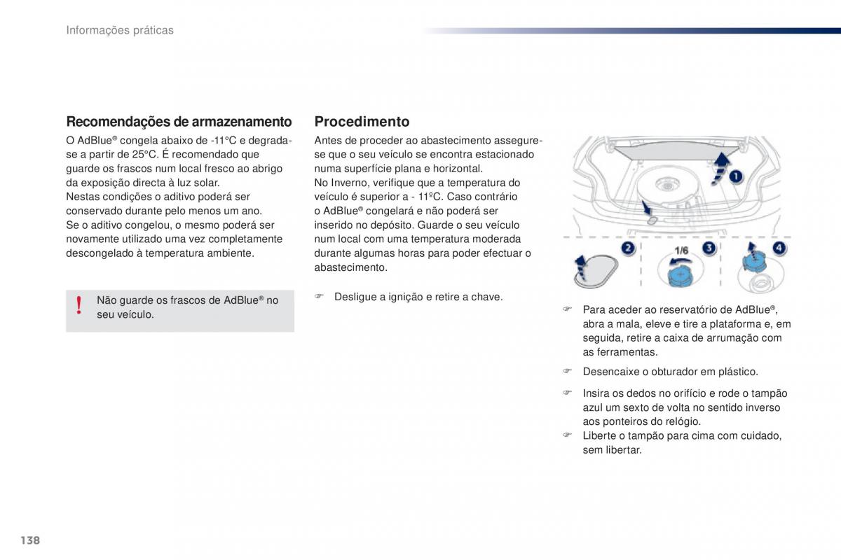 Não guarde os frascos de AdBlue® no F Desligue a ignição e retire a chave.