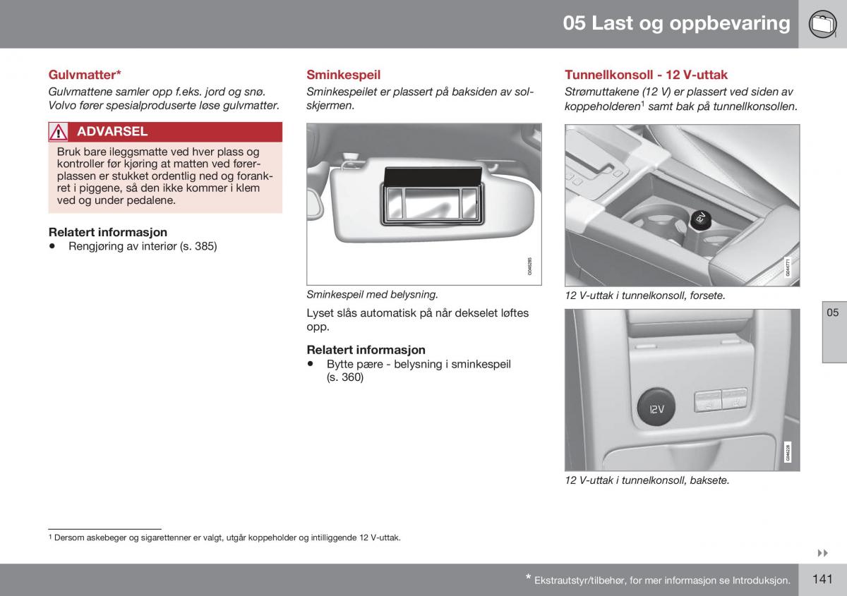 Gulvmattene samler opp f.eks. jord og snø. Sminkespeilet er plassert på baksiden av sol- Strømuttakene (12 V) er plassert ved siden av