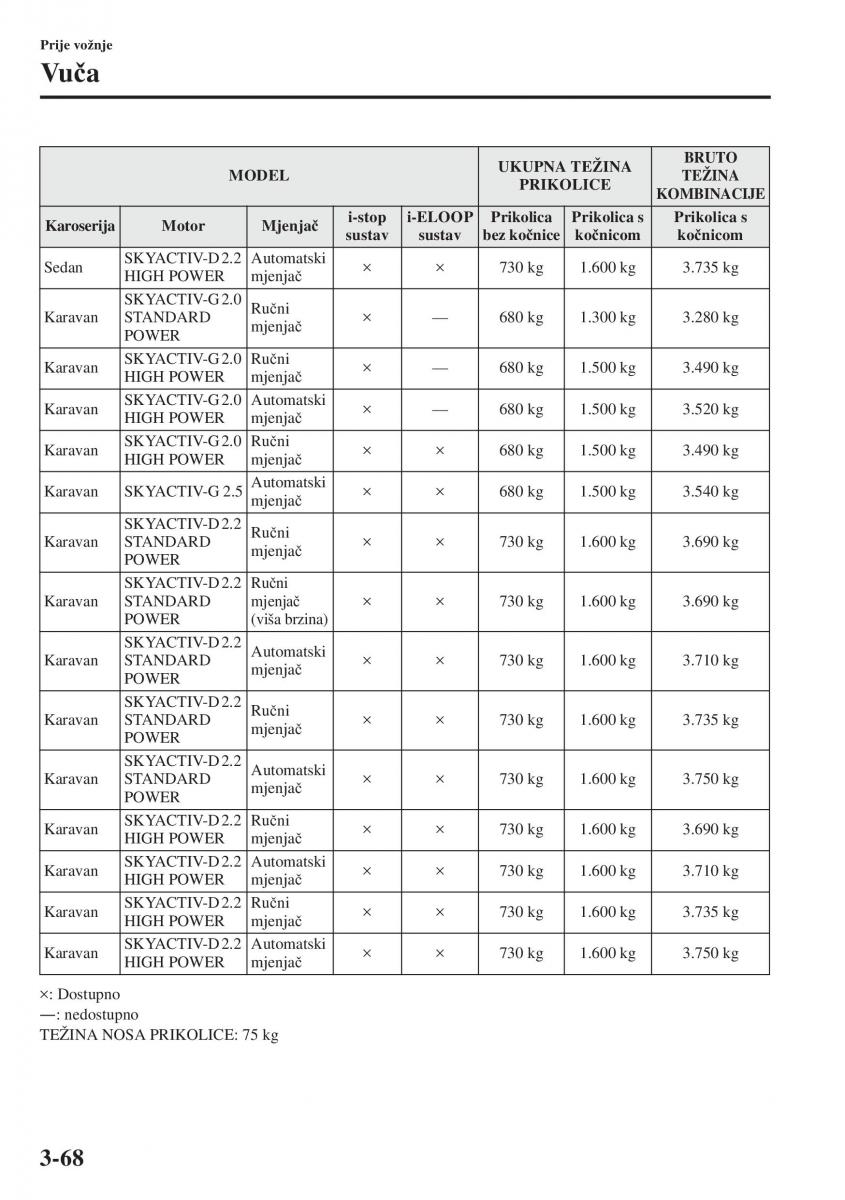 Karavan SKYACTIV-D 2.2 Automatski × × 730 kg 1.600 kg 3.750 kg
