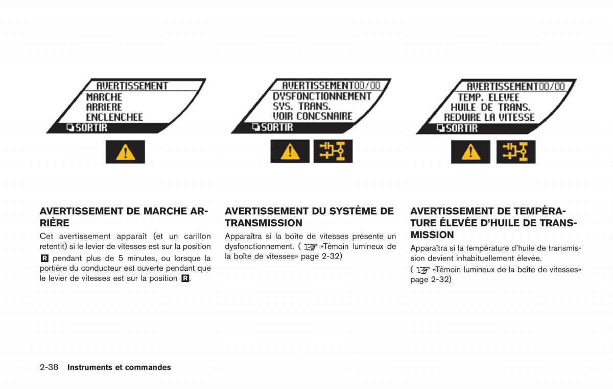 Cet avertissement apparaıt (et un carillon Apparaıtra si la boıte de vitesses presente un