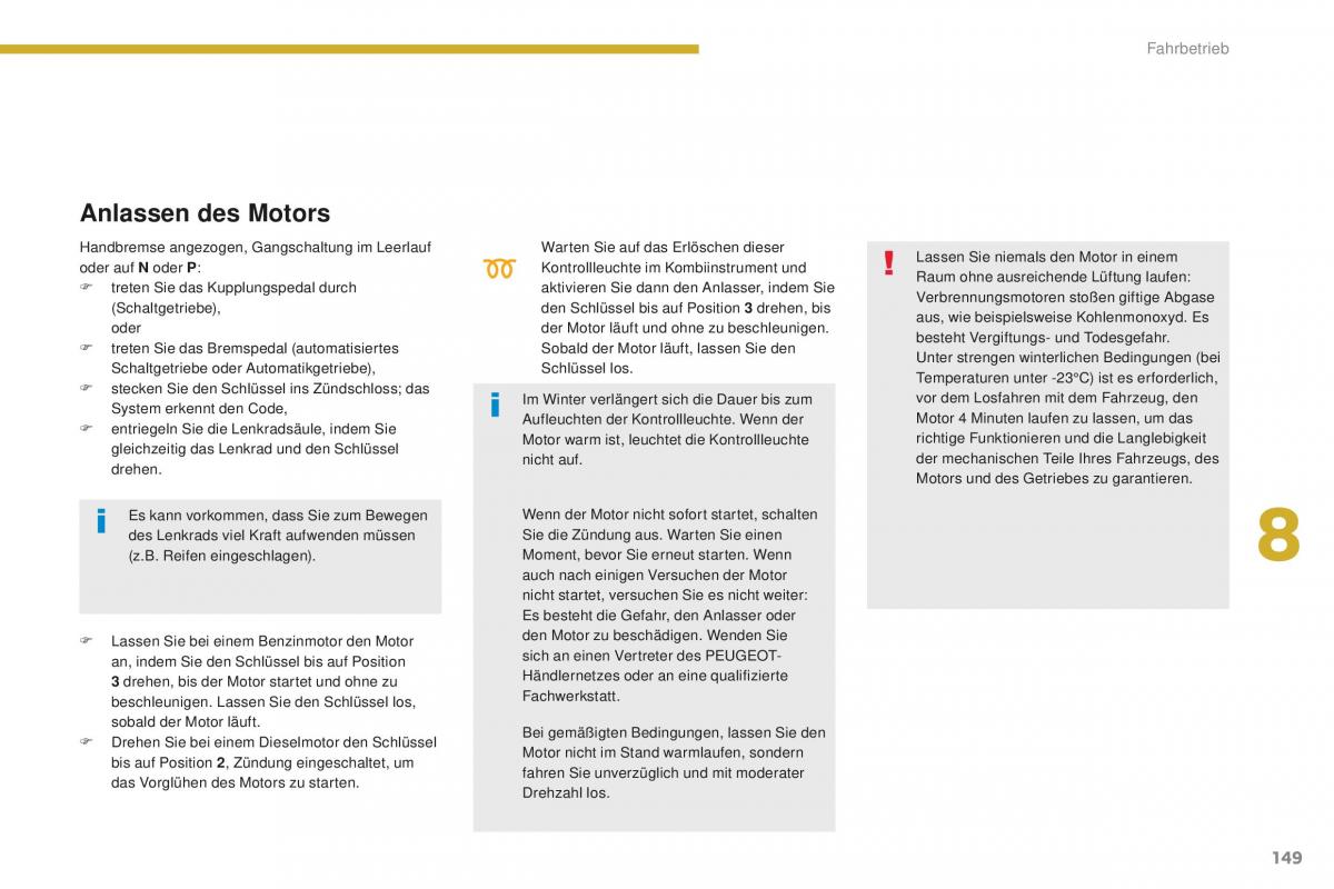Handbremse angezogen, gangschaltung im Leerlauf Warten Sie auf das erlöschen dieser Lassen Sie niemals den Motor in einem