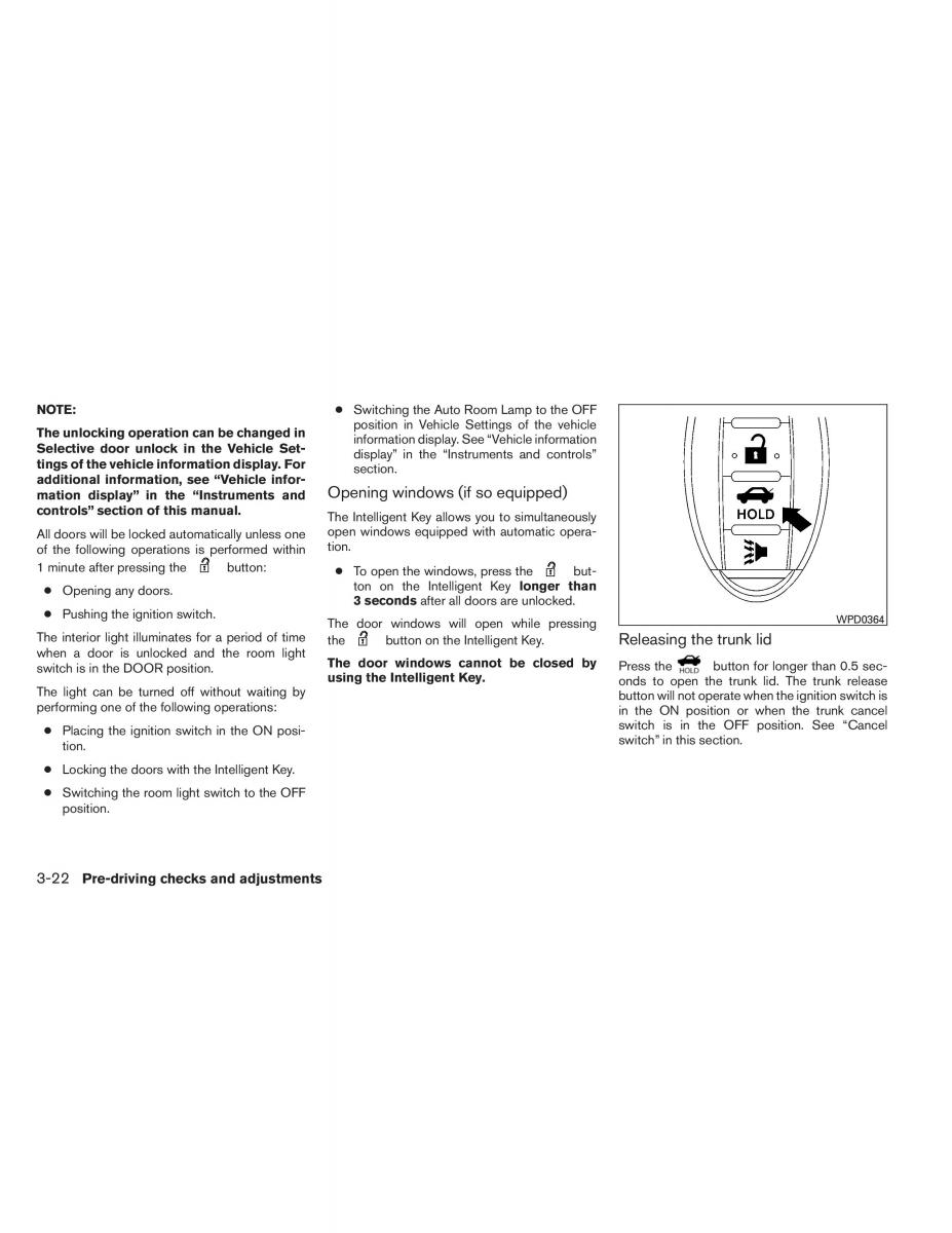 ● Pushing the ignition switch.The door windows will open while pressing WPD0364