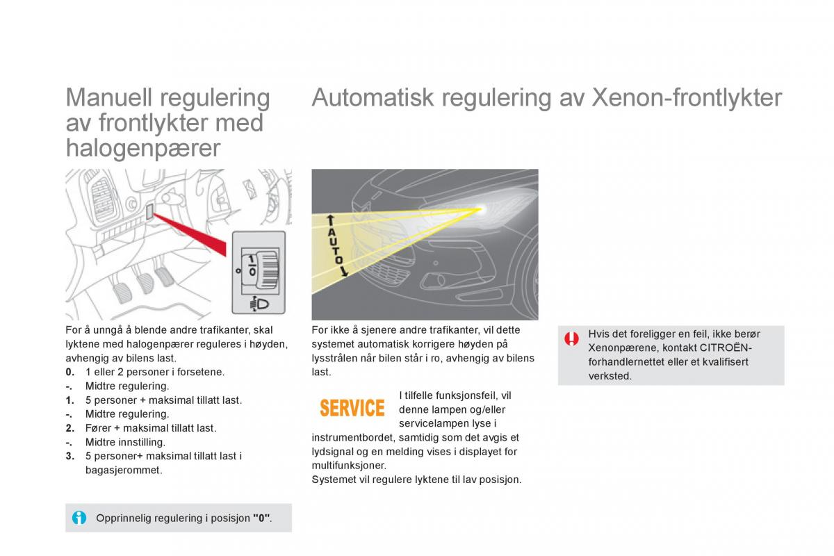 lyktene med halogenpærer reguleres i høyden, systemet automatisk korrigere høyden på Xenonpærene, kontakt CITROËN-