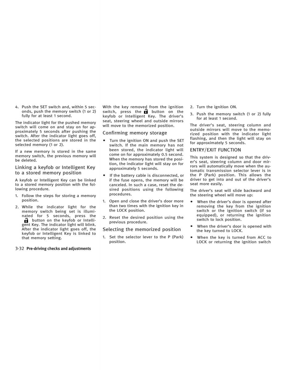 switch will come on and stay on for ap-will move to the memorized position.The driver’s seat, steering column and