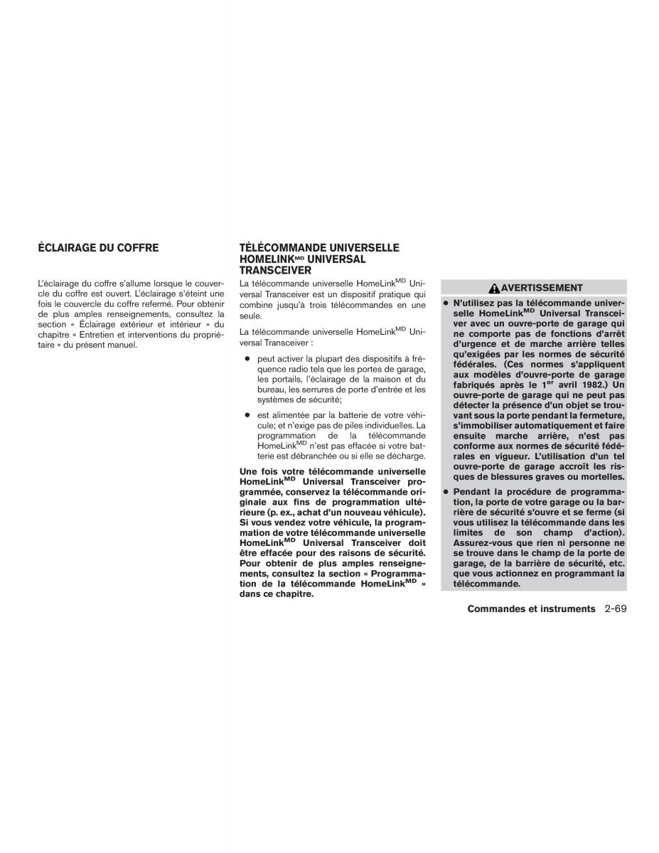 L’éclairage du coffre s’allume lorsque le couver- La télécommande universelle HomeLinkMD Uni- AVERTISSEMENT