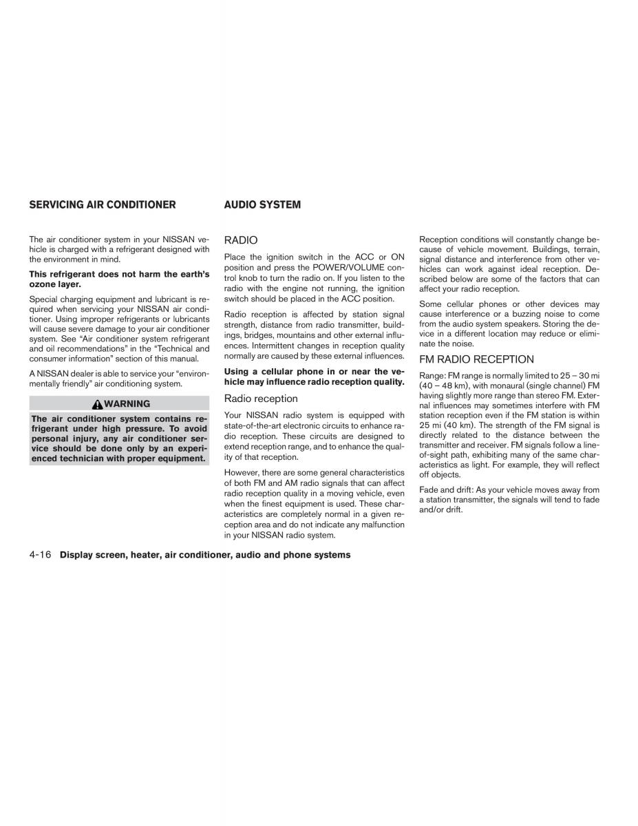 The air conditioner system contains re-Your NISSAN radio system is equipped withstation reception even if the FM station is within