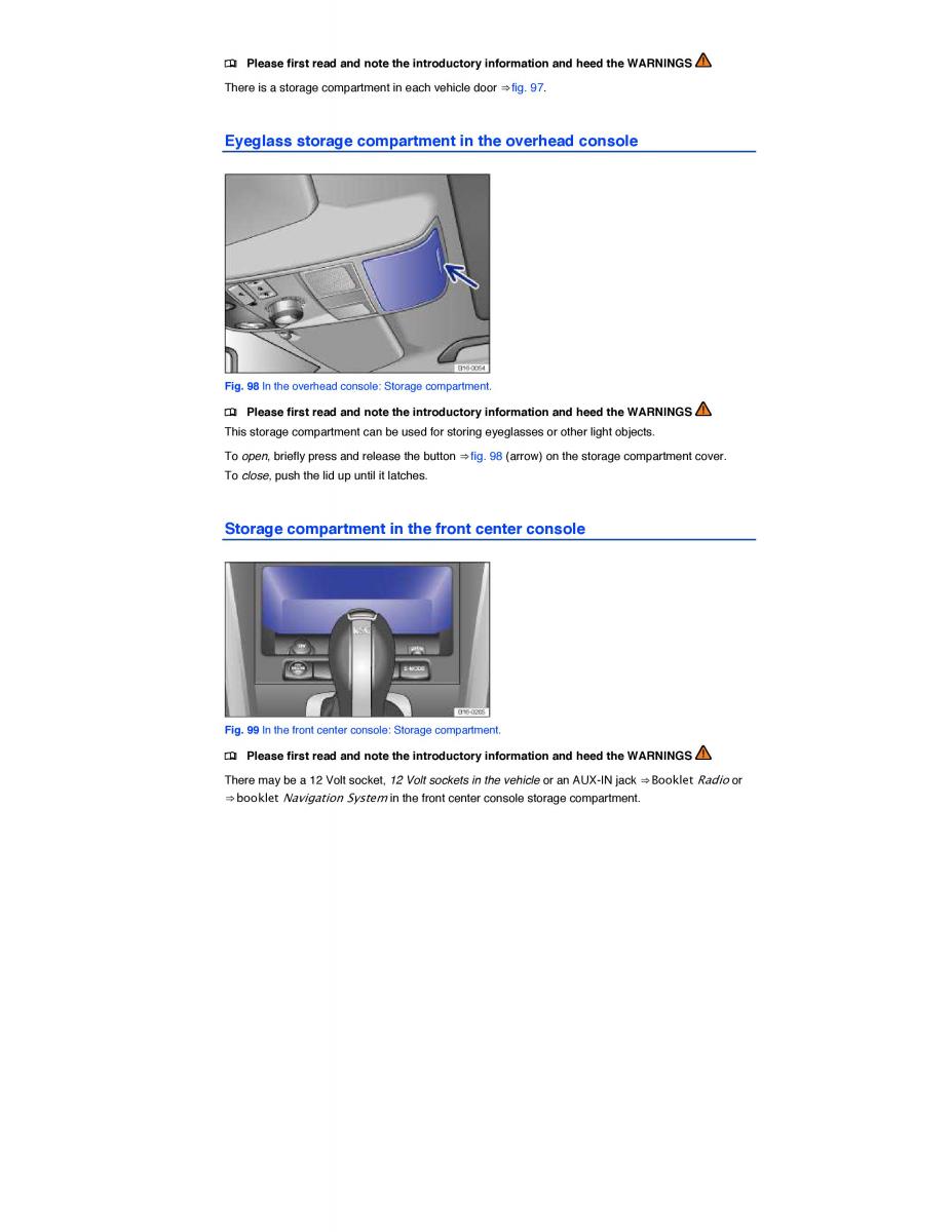 To open, briefly press and release the button ⇒ fig. 98 (arrow) on the storage compartment cover.