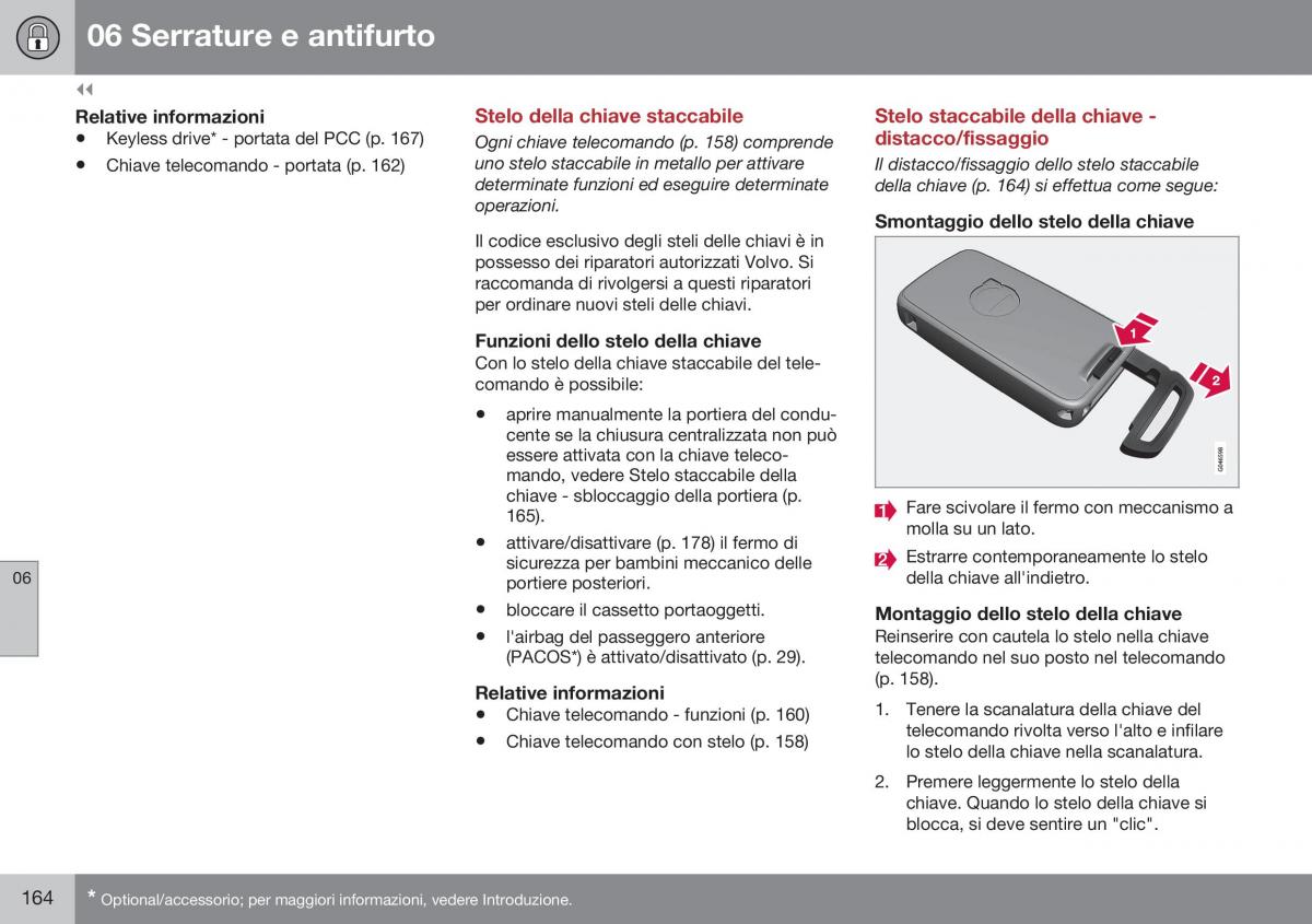 Chiave telecomando - portata (p. 162)uno stelo staccabile in metallo per attivareIl distacco/fissaggio dello stelo staccabile