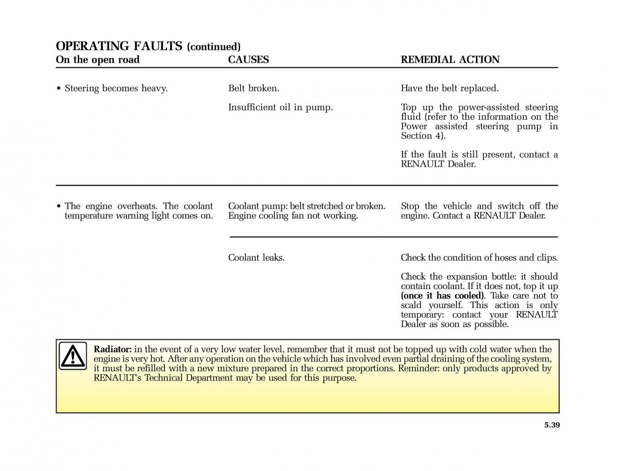 temperature warning light comes on.Engine cooling fan not working.engine. Contact a RENAULT Dealer.