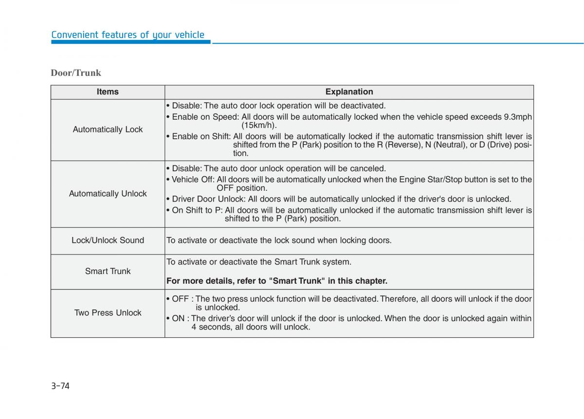 • Vehicle Off: All doors will be automatically unlocked when the Engine Star/Stop button is set to the