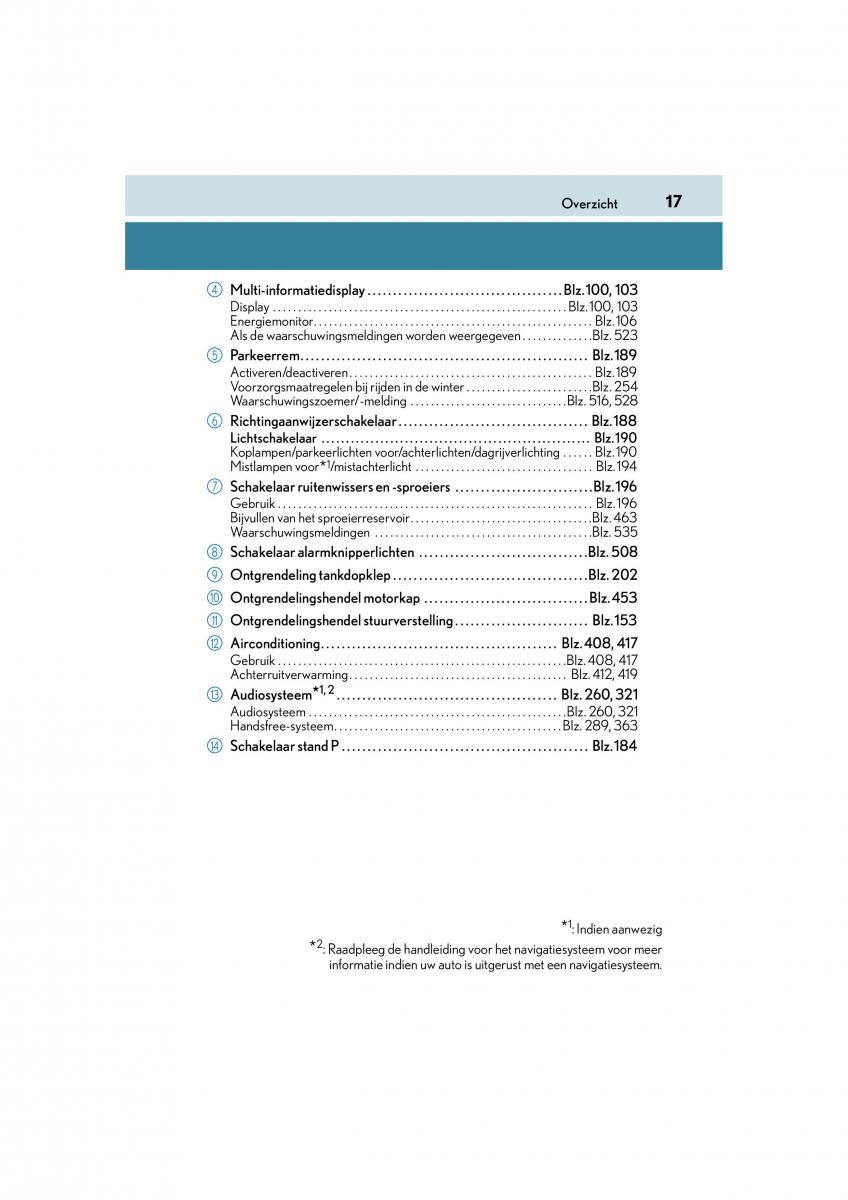 13Audiosysteem*1, 2. . . . . . . . . . . . . . . . . . . . . . . . . . . . . . . . . . . . . . . . . . . Blz. 260, 321