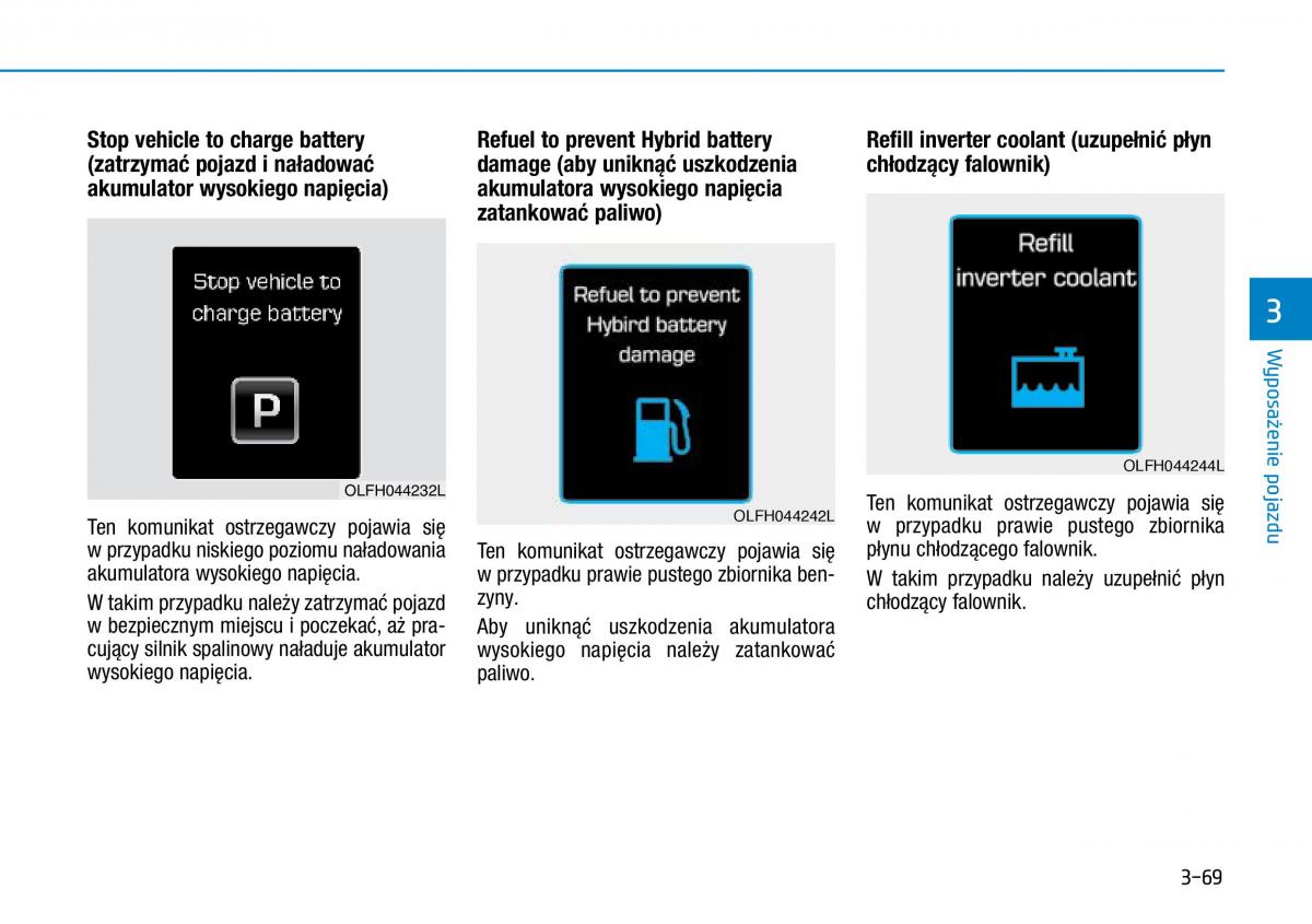 Stop vehicle to charge battery Refuel to prevent Hybrid battery Refill inverter coolant (uzupełnić płyn