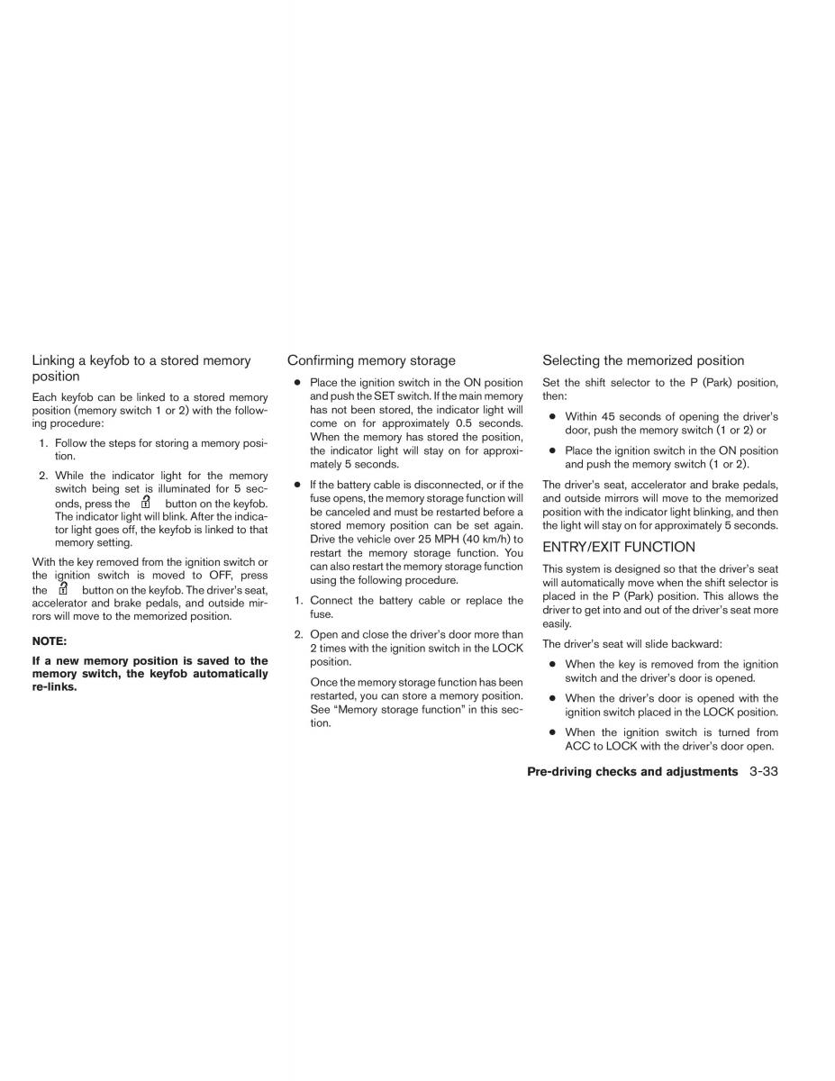 the ignition switch is moved to OFF, presscanalsorestartthememorystoragefunctionThis system is designed so that the driver’s seat
