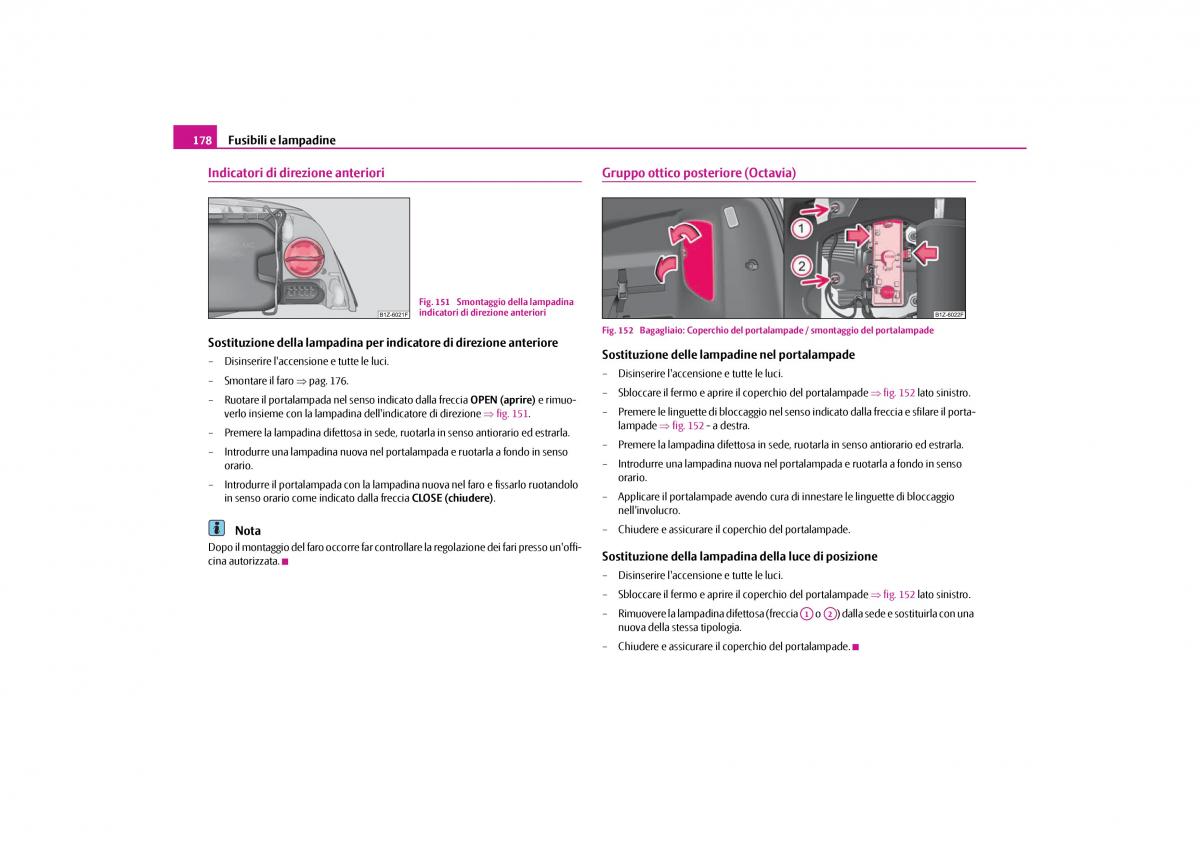 – Ruotare il portalampada nel senso indicato dalla freccia OPEN (aprire) e rimuo-– Sbloccare il fermo e aprire il coperchio del portalampade fig. 152 lato sinistro.