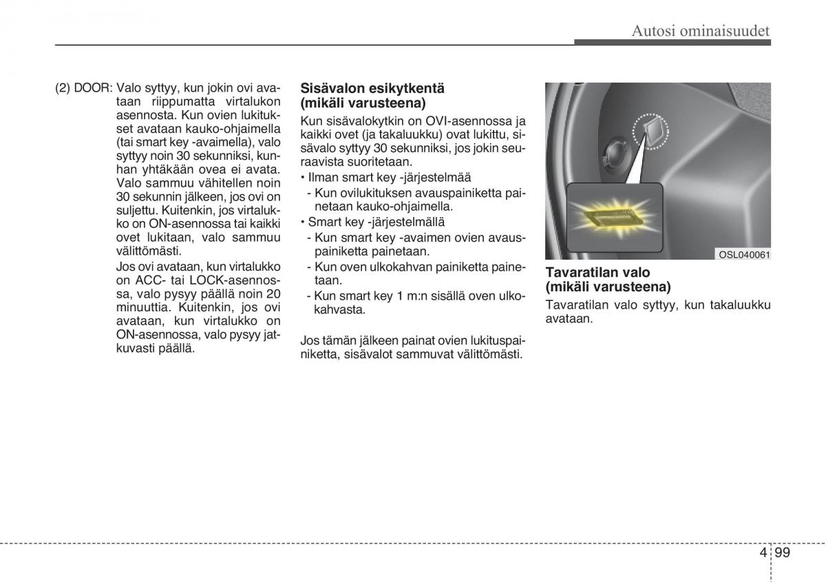 sa, valo pysyy päällä noin 20- Kun smart key 1 m:n sisällä oven ulko-Tavaratilan valo syttyy, kun takaluukku