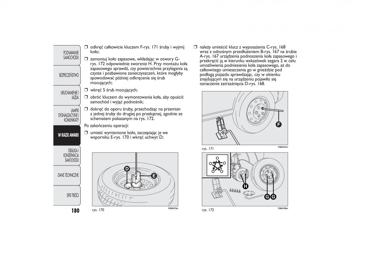 SAMOCHODU ❒ zamontuj koło zapasowe, wkładając w otwory G- A-rys. 167 urządzenia podnoszenia koła zapasowego i