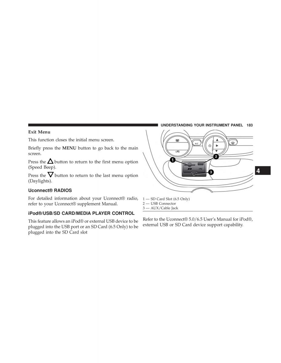 ThisfeatureallowsaniPod®orexternalUSBdevicetobe RefertotheUconnect®5.0/6.5User’sManualforiPod®,