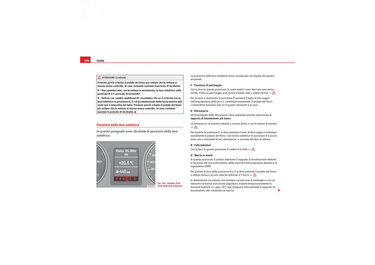 posizioni R o P: pericolo di incidente! mente. Il blocco parcheggio può essere inserito solo a vettura ferma ⇒.