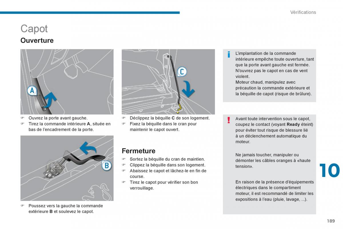 Ouvrez la porte avant gauche. Déclippez la béquille C de son logement. Avant toute intervention sous le capot,