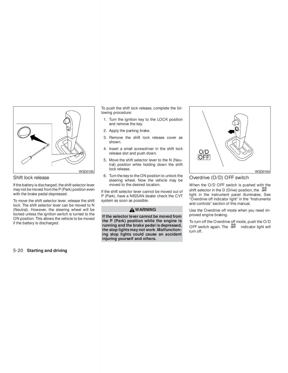 To move the shift selector lever, release the shiftsystem as soon as possible.“Overdrive off indicator light” in the “Instruments