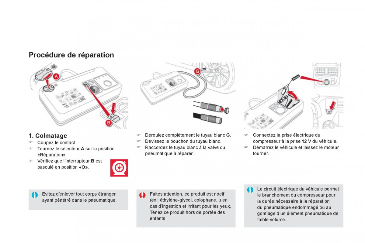 ) Coupez le contact. ) Dévissez le bouchon du tuyau blanc. compresseur à la prise 12 V du véhicule.