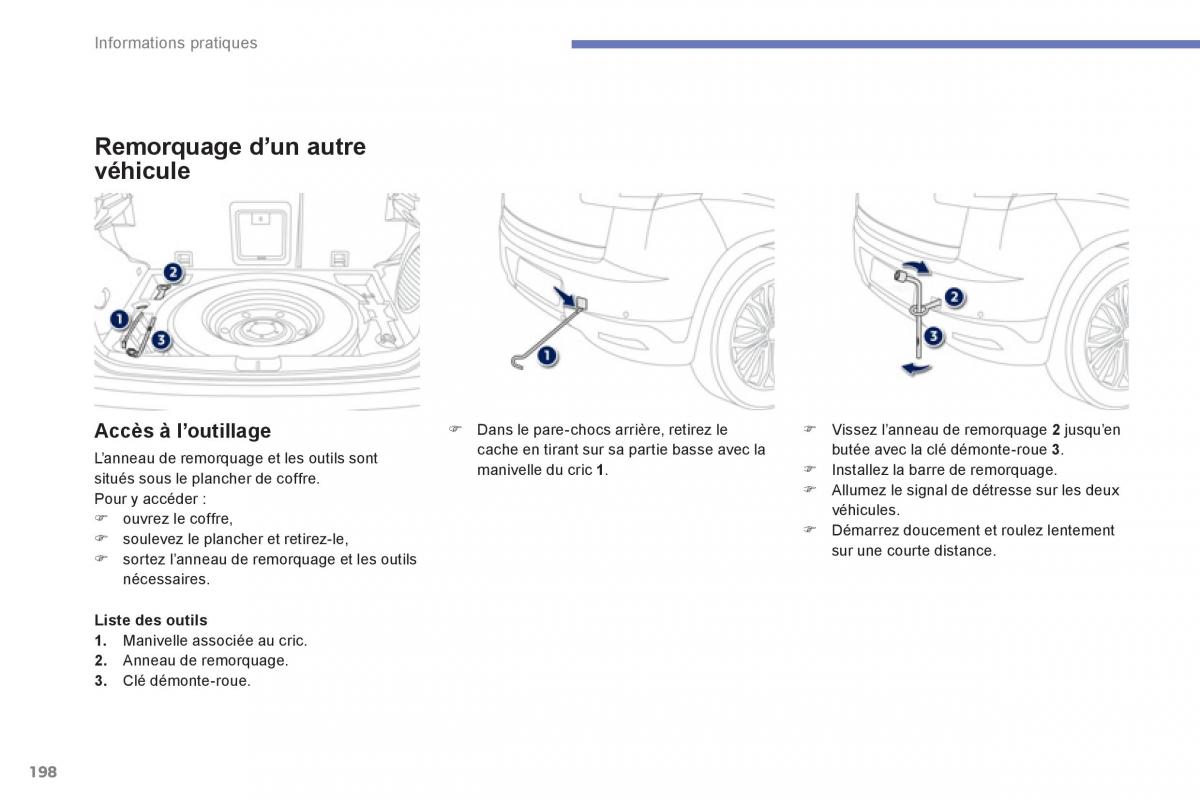 situés sous le plancher de coffre.manivelle du cric 1 . ) Installez la barre de remorquage.