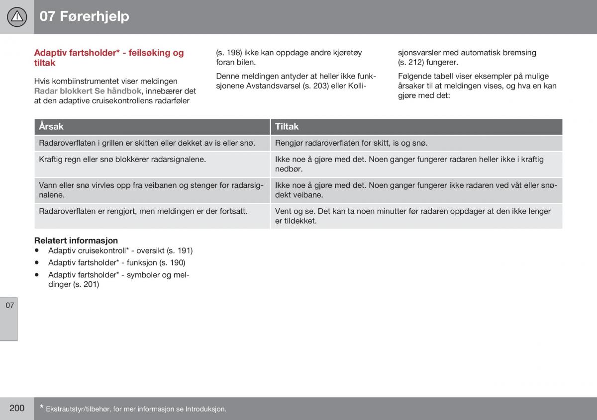 Adaptiv fartsholder* - feilsøking og(s. 198) ikke kan oppdage andre kjøretøysjonsvarsler med automatisk bremsing