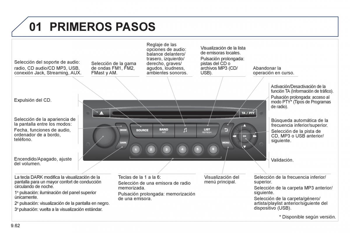 radio, CD audio/CD MP3, USB, de ondas FM1, FM2, agudos, loudness, archivos MP3 (CD/ A bandonar la
