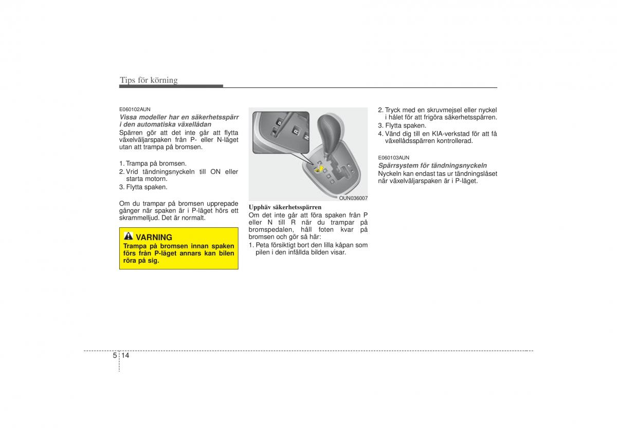 växelväljarspaken från P- eller N-läget 4.Vänd dig till en KIA-verkstad för att få