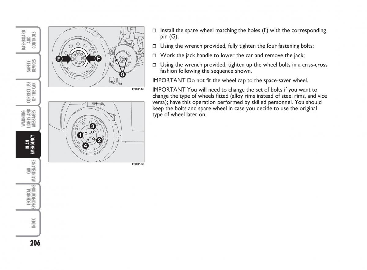 ❒ Install the spare wheel matching the holes (F) with the corresponding