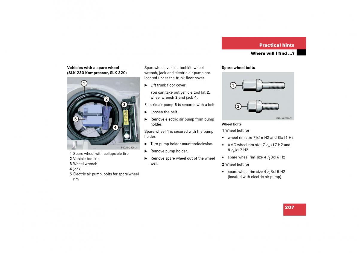 (SLK230Kompressor, SLK320)wrench, jack and electric air pump are