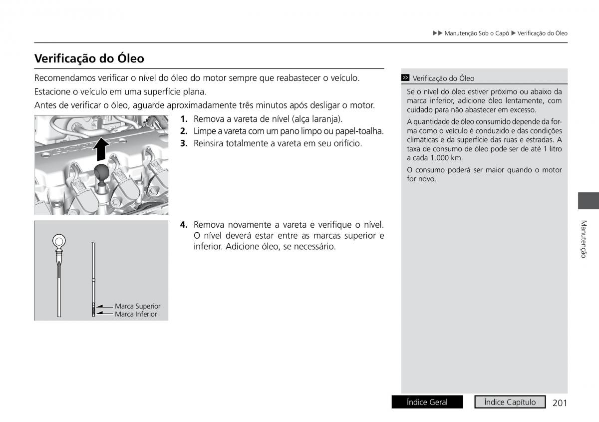 Recomendamos verificar o nível do óleo do motor sempre que reabastecer o veículo. Verificação do Óleo