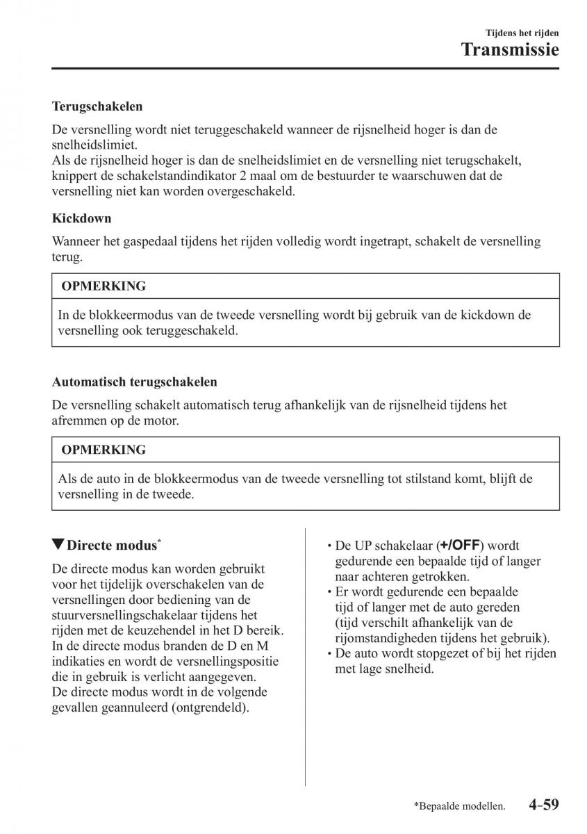 De versnelling schakelt automatisch terug afhankelijk van de rijsnelheid tijdens het