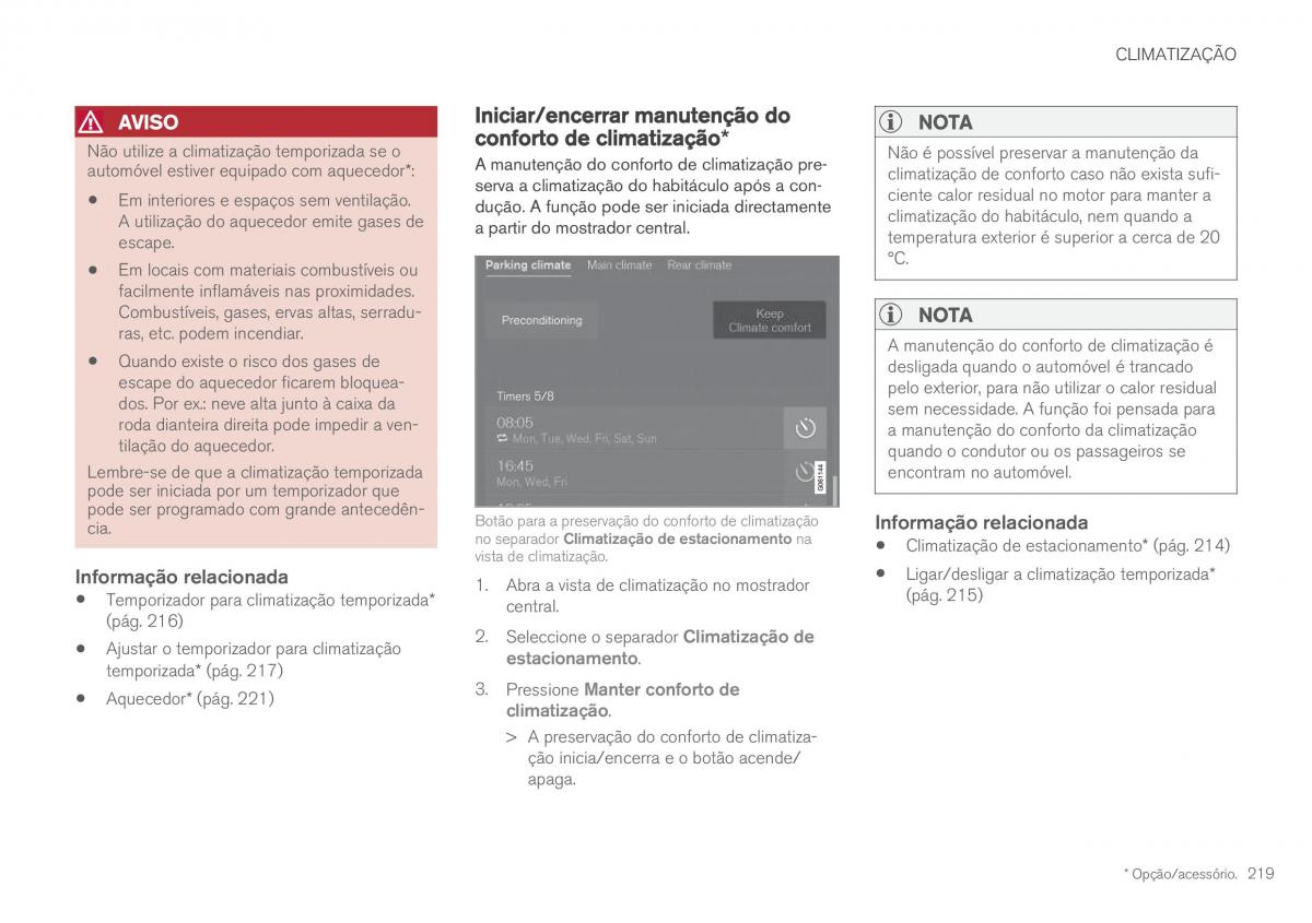 vista de climatização. • Climatização de estacionamento* (pág. 214)