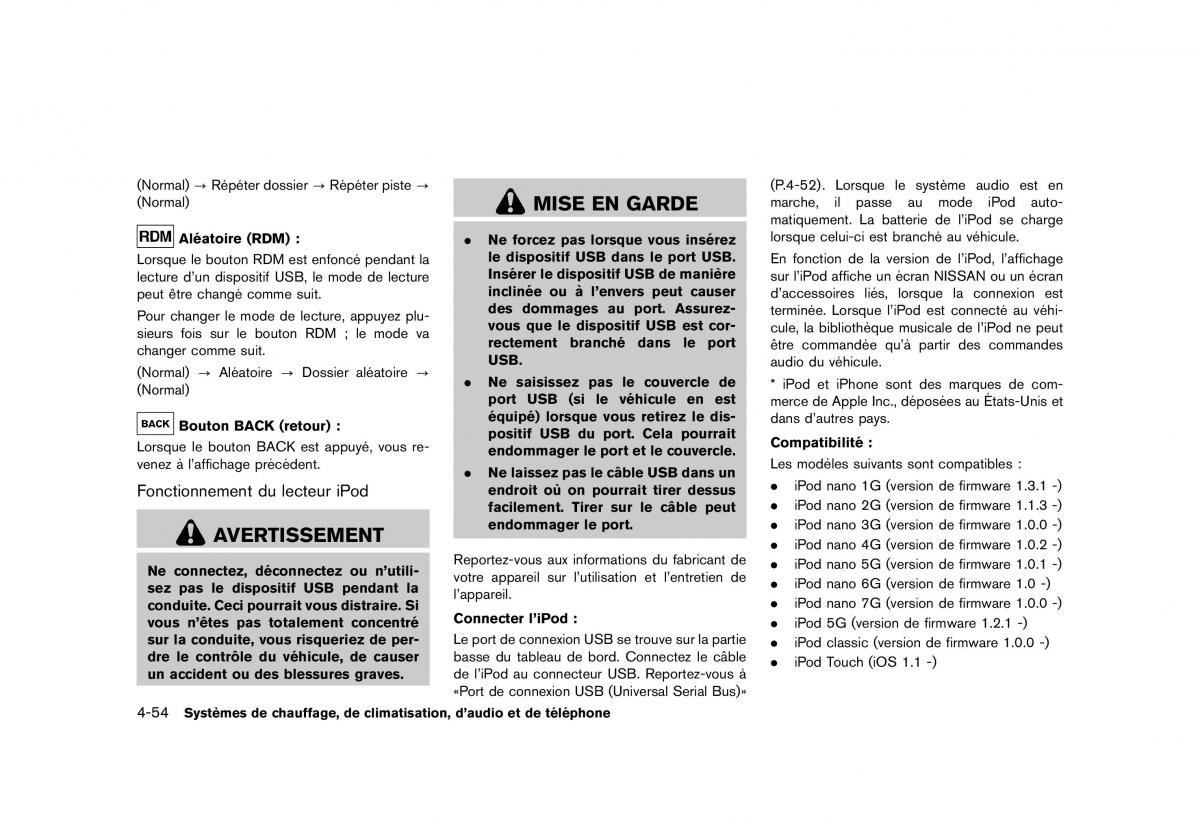 lecture d’un dispositif USB, le mode de lecture sur l’iPod affiche un ecran NISSAN ou un ecran